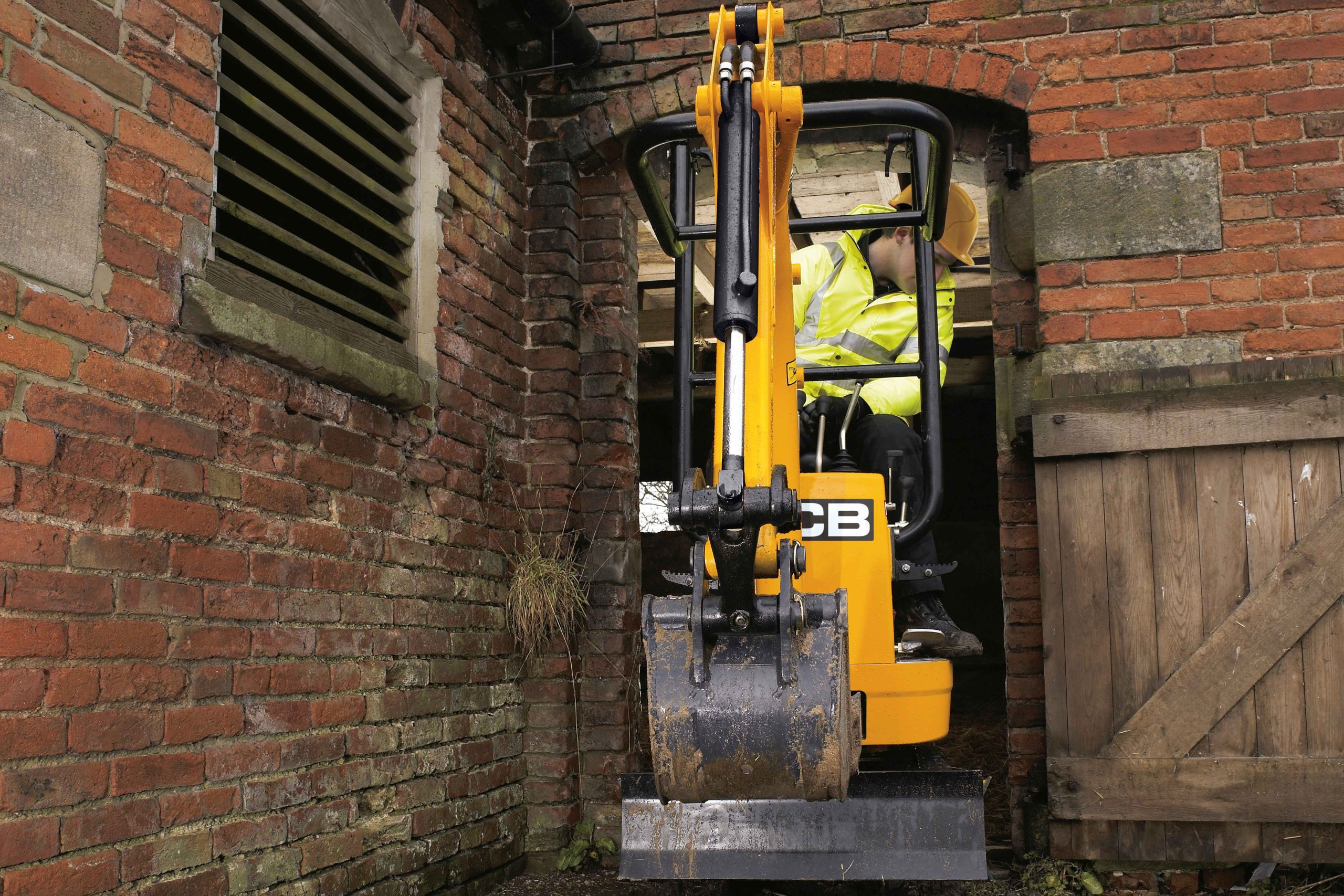 JCB 8008 has been designed to work in buildings and confined spaces. JCB 8008 tracks can be retracted from 865mm to 700mm to allow the 8008 to pass though doorways. The JCB 8008 TOPS frame can also be folded to allow a machine height of less than 2m.